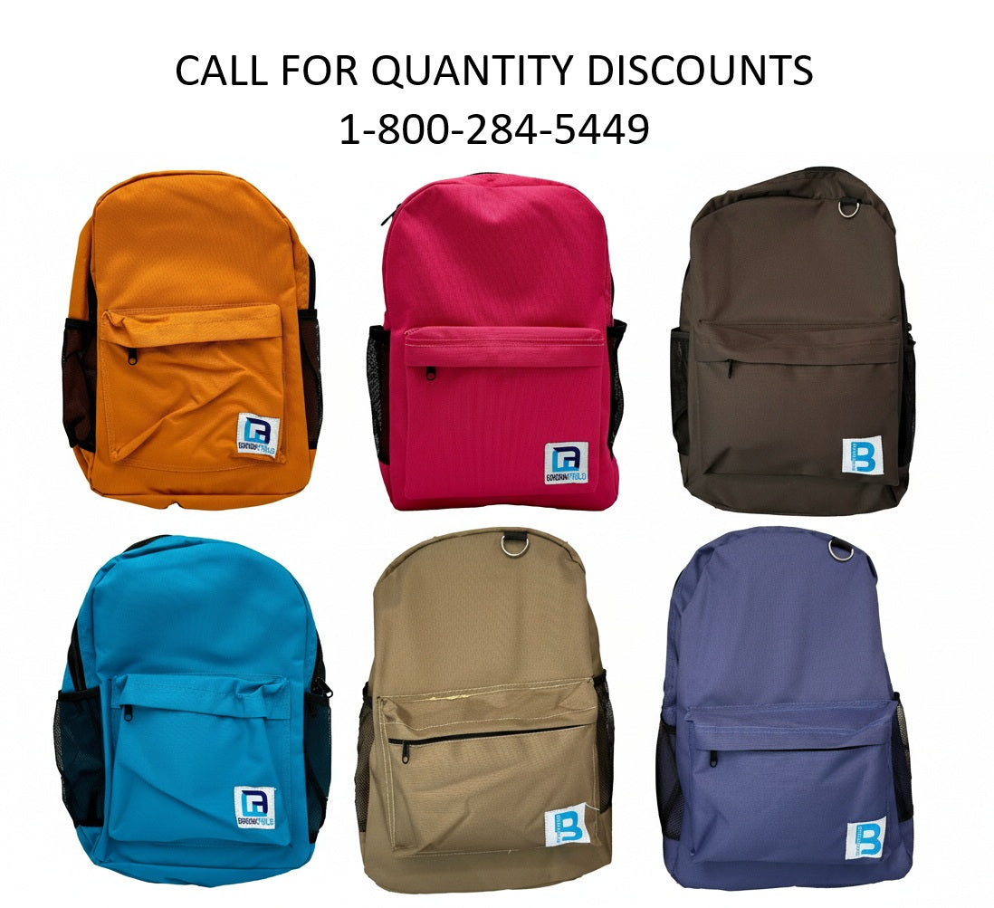 Size: 11 x 5.5 x 17 in Colors: orange, teal, pink, navy blue, black, and khaki Adjustable reinforced shoulder straps Multiple compartments O ring Basic school...