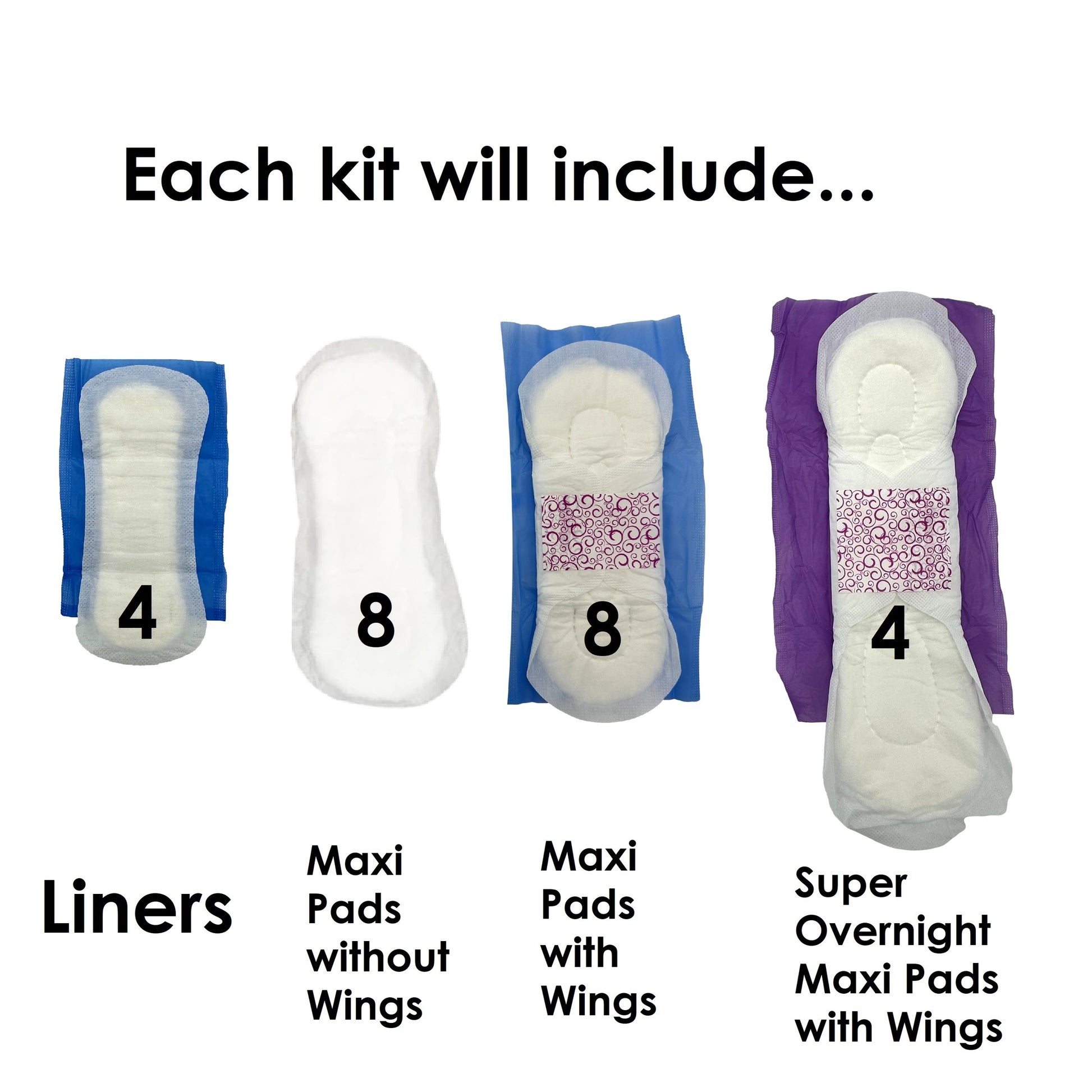 - 4 protectores diarios, 8 toallas sanitarias maxi regulares, 8 toallas sanitarias maxi regulares con alas y 4 toallas sanitarias maxi super nocturnas con alas, bolsa con cierre.